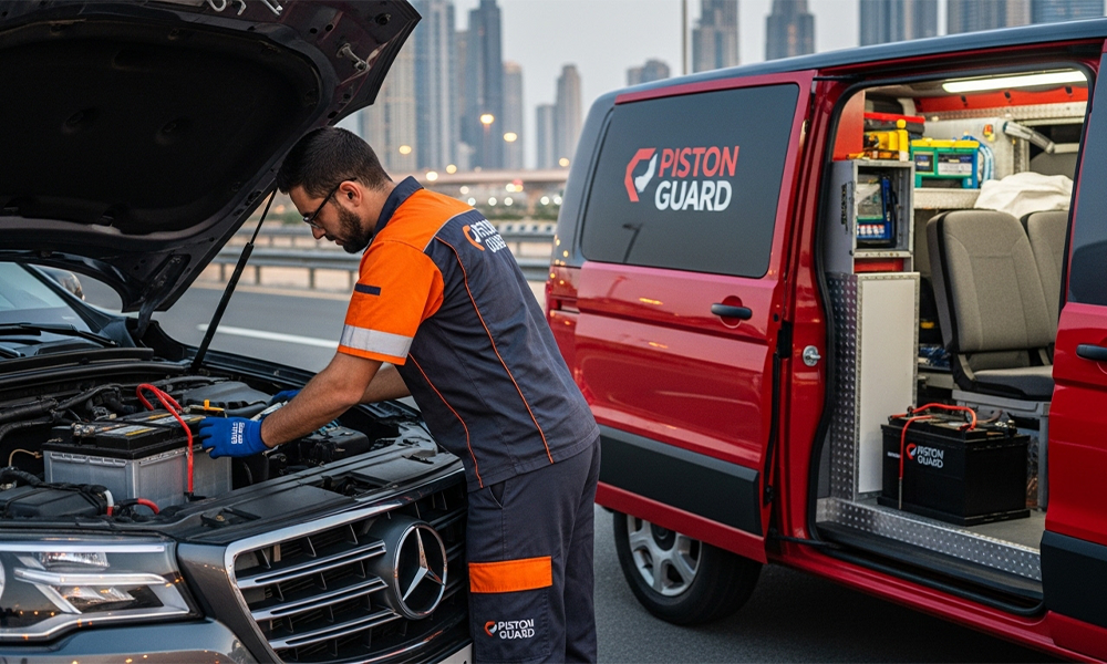 Need a quick battery change anywhere in the UAE? At Piston Guard, we offer fast replacement, trusted battery brands, and 24/7 mobile service across Dubai, Sharjah, Ajman, Abu Dhabi, and RAK. We handle all car models—from sedans to SUVs. We offer a simple on-site process backed by real customer stories, clear benefits, and answers to every battery question.