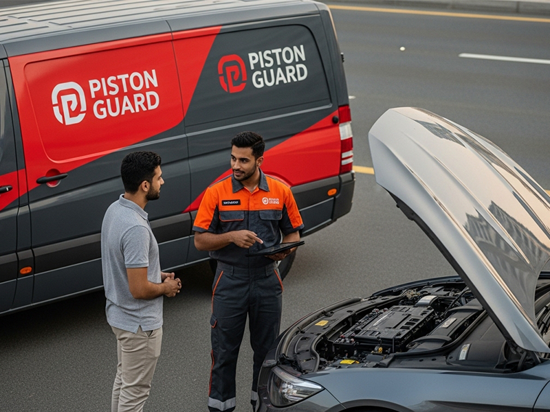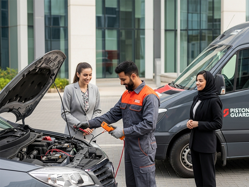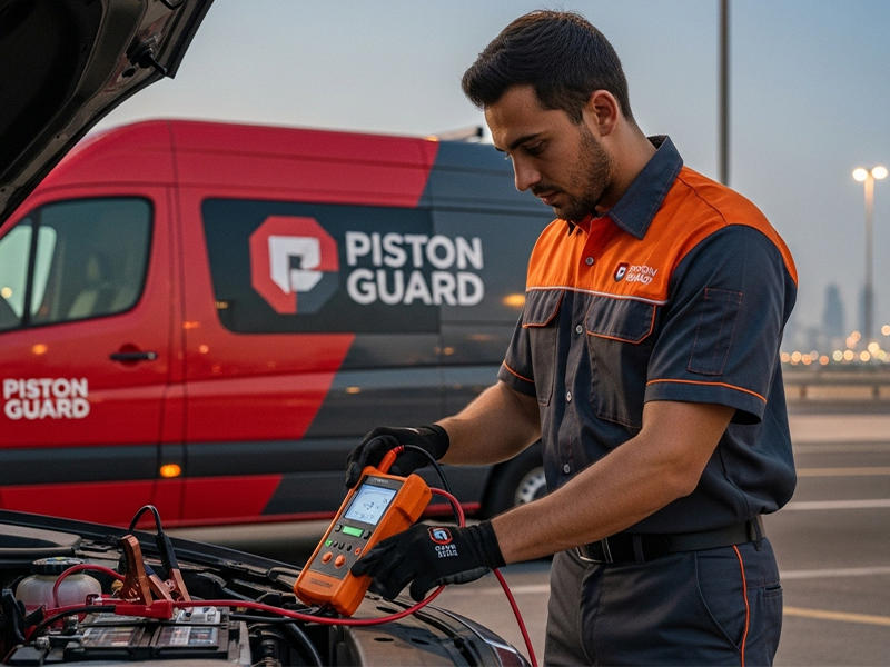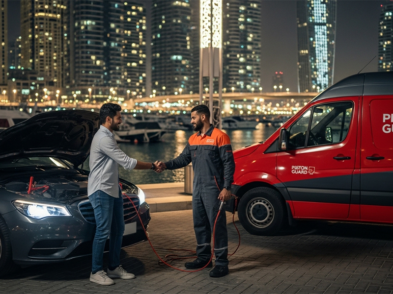 Stuck with a dead battery? Don’t stress. Piston Guard’s jump start service is available day and night across Dubai, Sharjah, Ajman, Abu Dhabi, and Ras Al Khaimah. Our expert technicians arrive in 30 minutes or less, safely boosting your car back to life without damaging your system.